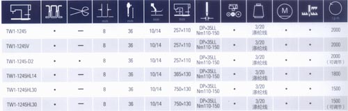 综合送料,大旋梭;压脚交互量2.5-7mm, 方便操作;“V" 具有包边功能;HL14/30具有加长加高的操作空间,方便大物件的缝制;“DT”具有自动倒缝,自动抬压脚和点动功能;适用于皮包及皮革制品的缝制。